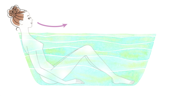 ゆったりとくつろいできたら、目を閉じて首を後ろに倒して湯ぶねのへりに乗せます。腕は前へ軽く伸ばし、楽な姿勢で座ります。